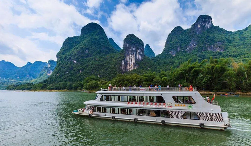 بدأنا رحلتنا في رصيف تشوجيانغ، وصعدنا على متن سفينة سياحية من فئة أربع نجوم في جولة بانورامية لنهر لي، جوهرة المناظر الطبيعية الرائعة في الصين، والتي غالبًا ما توصف بعبارة "النهر كشريط أخضر، والجبال مثل دبوس شعر من اليشم". قدمت الرحلة البحرية وليمة بصرية من القمم الغريبة التي تنعكس على الماء، والضفاف الخضراء، والأغاني الرعوية، والصيادين في أوقات فراغهم، والتي تجسد جوهر المناظر الطبيعية في غويلين.