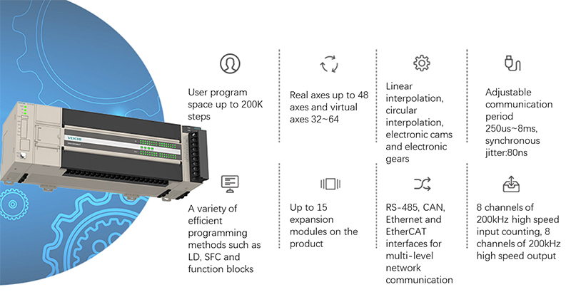 تعتبر سلسلة VEICHI VC5 من الجيل الجديد من وحدات التحكم المنطقية القابلة للبرمجة عالية الأداء والمرنة مع تقنية بنية ثنائية النواة، وتدعم ما يصل إلى 48 محورًا حقيقيًا من EtherCAT. تتميز هذه الآلة بقدرتها على التحكم في الحركة بسرعة عالية مع دورة اتصال تبلغ 250 ميكروثانية ودقة وقت المزامنة 80 نانوثانية لتحقيق ضغط دقيق.